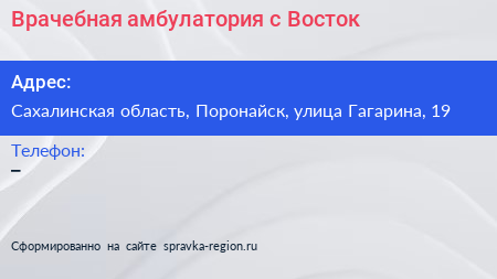 Врачебная амбулатория, с. Восток по адресу Сахалинская область, Поронайск, улица Гагарина, 19 в дальнейшем Организация, размещена в следующих категориях: