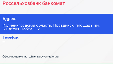 Россельхозбанк, банкомат по адресу Калининградская область, Правдинск, площадь им. 50-летия Победы, 2 в дальнейшем Организация, размещена в следующих категориях: