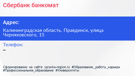 Сбербанк, банкомат по адресу Калининградская область, Правдинск, улица Черняховского, 15 в дальнейшем Организация, размещена в следующих категориях: