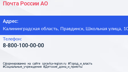 Почта России, АО по адресу Калининградская область, Правдинск, Школьная улица, 10 в дальнейшем Организация, размещена в следующих категориях:
