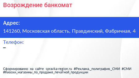 Возрождение, банкомат по адресу 141260, Московская область, Правдинский, Фабричная, 4 в дальнейшем Организация, размещена в следующих категориях: