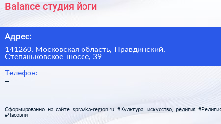 Balance, студия йоги по адресу 141260, Московская область, Правдинский, Степаньковское шоссе, 39 в дальнейшем Организация, размещена в следующих категориях: