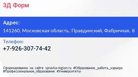 3Д-Форм по адресу 141260, Московская область, Правдинский, Фабричная, 8 в дальнейшем Организация, размещена в следующих категориях: