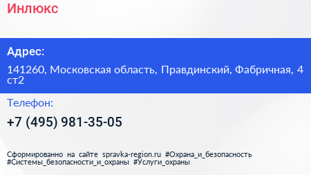 Инлюкс по адресу 141260, Московская область, Правдинский, Фабричная, 4 ст2 в дальнейшем Организация, размещена в следующих категориях: