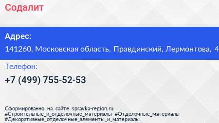 Содалит по адресу 141260, Московская область, Правдинский, Лермонтова, 4 в дальнейшем Организация, размещена в следующих категориях: