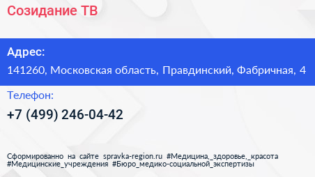 Созидание ТВ по адресу 141260, Московская область, Правдинский, Фабричная, 4 в дальнейшем Организация, размещена в следующих категориях: