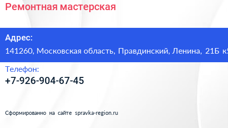 Ремонтная мастерская по адресу 141260, Московская область, Правдинский, Ленина, 21Б к5 в дальнейшем Организация, размещена в следующих категориях: