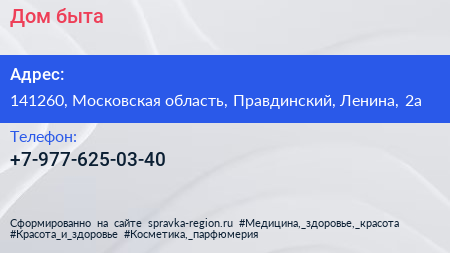 Дом быта по адресу 141260, Московская область, Правдинский, Ленина, 2а в дальнейшем Организация, размещена в следующих категориях: