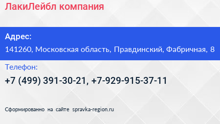 ЛакиЛейбл, компания по адресу 141260, Московская область, Правдинский, Фабричная, 8 в дальнейшем Организация, размещена в следующих категориях: