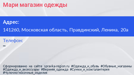Мари, магазин одежды по адресу 141260, Московская область, Правдинский, Ленина, 20а в дальнейшем Организация, размещена в следующих категориях: