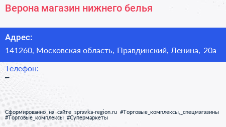 Верона, магазин нижнего белья по адресу 141260, Московская область, Правдинский, Ленина, 20а в дальнейшем Организация, размещена в следующих категориях: