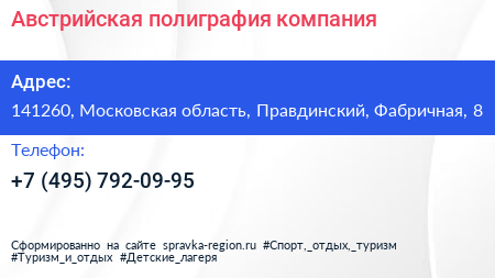 Австрийская полиграфия, компания по адресу 141260, Московская область, Правдинский, Фабричная, 8 в дальнейшем Организация, размещена в следующих категориях: