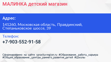 МАЛИНКА, детский магазин по адресу 141260, Московская область, Правдинский, Степаньковское шоссе, 39 в дальнейшем Организация, размещена в следующих категориях: