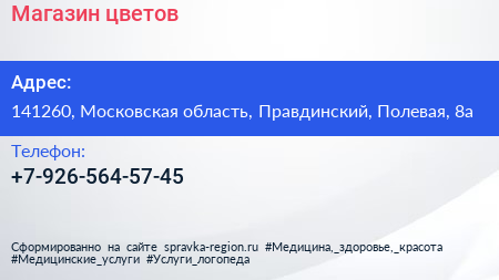 Магазин цветов по адресу 141260, Московская область, Правдинский, Полевая, 8а в дальнейшем Организация, размещена в следующих категориях: