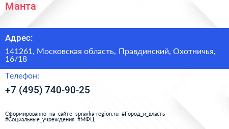 Манта по адресу 141261, Московская область, Правдинский, Охотничья, 16/18 в дальнейшем Организация, размещена в следующих категориях: