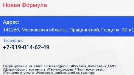Новая Формула по адресу 141260, Московская область, Правдинский, Герцена, 30 к1 в дальнейшем Организация, размещена в следующих категориях: