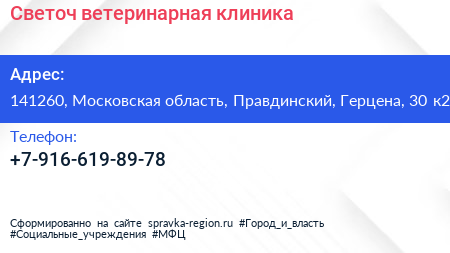 Светоч, ветеринарная клиника по адресу 141260, Московская область, Правдинский, Герцена, 30 к2 в дальнейшем Организация, размещена в следующих категориях: