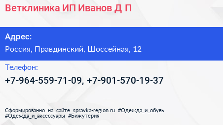Ветклиника, ИП Иванов Д.П. по адресу Торговый центр "Премьер", 12, Шоссейная улица, Зеленоградский, Пушкинский городской округ, Московская область, Центральный федеральный округ, 141253, Россия в дальнейшем Организация, размещена в следующих категориях: