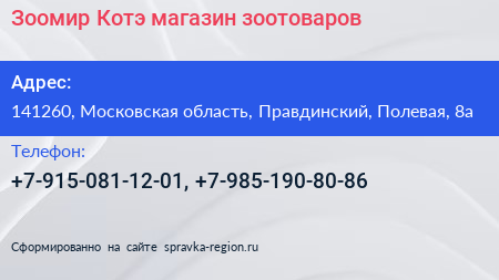 Зоомир Котэ, магазин зоотоваров по адресу 141260, Московская область, Правдинский, Полевая, 8а в дальнейшем Организация, размещена в следующих категориях: