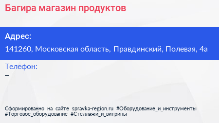 Багира, магазин продуктов по адресу 141260, Московская область, Правдинский, Полевая, 4а в дальнейшем Организация, размещена в следующих категориях: