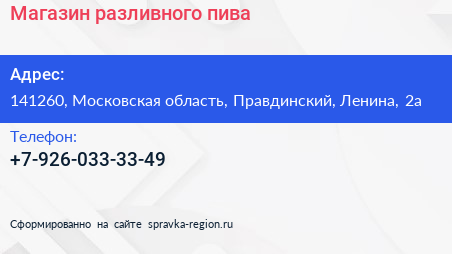 Магазин разливного пива по адресу 141260, Московская область, Правдинский, Ленина, 2а в дальнейшем Организация, размещена в следующих категориях: