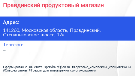 Правдинский, продуктовый магазин по адресу 141260, Московская область, Правдинский, Степаньковское шоссе, 17а в дальнейшем Организация, размещена в следующих категориях: