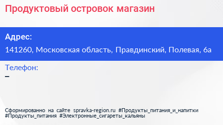 Продуктовый островок, магазин по адресу 141260, Московская область, Правдинский, Полевая, 6а в дальнейшем Организация, размещена в следующих категориях: