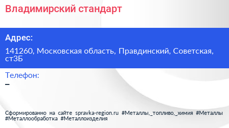 Владимирский стандарт по адресу 141260, Московская область, Правдинский, Советская, ст3Б в дальнейшем Организация, размещена в следующих категориях: