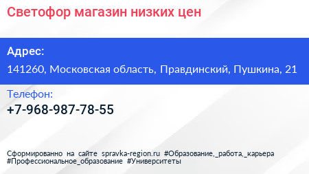 Светофор, магазин низких цен по адресу 141260, Московская область, Правдинский, Пушкина, 21 в дальнейшем Организация, размещена в следующих категориях: