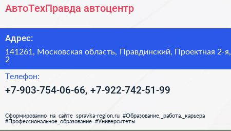 АвтоТехПравда, автоцентр по адресу 141261, Московская область, Правдинский, Проектная 2-я, 2 в дальнейшем Организация, размещена в следующих категориях: