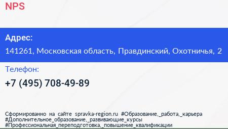 NPS по адресу 141261, Московская область, Правдинский, Охотничья, 2 в дальнейшем Организация, размещена в следующих категориях: