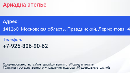 Ариадна, ателье по адресу 141260, Московская область, Правдинский, Лермонтова, 4 в дальнейшем Организация, размещена в следующих категориях: