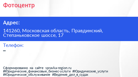 Фотоцентр по адресу 141260, Московская область, Правдинский, Степаньковское шоссе, 17 в дальнейшем Организация, размещена в следующих категориях: