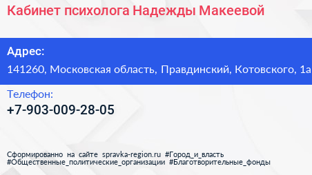 Кабинет психолога Надежды Макеевой по адресу 141260, Московская область, Правдинский, Котовского, 1а в дальнейшем Организация, размещена в следующих категориях: