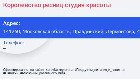 Королевство ресниц, студия красоты по адресу 141260, Московская область, Правдинский, Лермонтова, 4 в дальнейшем Организация, размещена в следующих категориях: