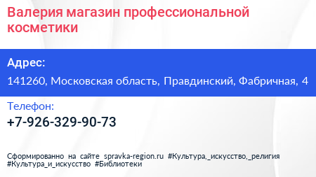 Валерия, магазин профессиональной косметики по адресу 141260, Московская область, Правдинский, Фабричная, 4 в дальнейшем Организация, размещена в следующих категориях: