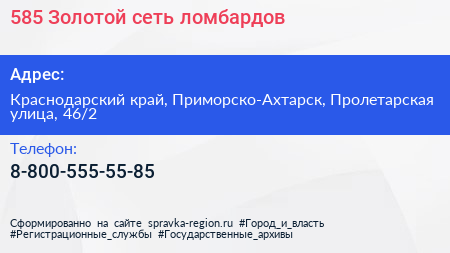585*Золотой, сеть ломбардов по адресу Краснодарский край, Приморско-Ахтарск, Пролетарская улица, 46/2 в дальнейшем Организация, размещена в следующих категориях: