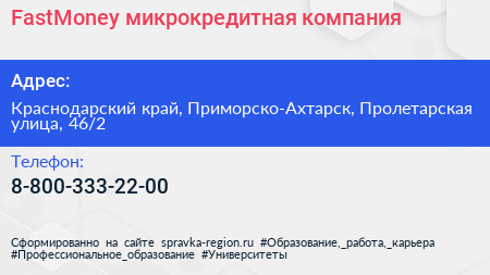 FastMoney, микрокредитная компания по адресу Краснодарский край, Приморско-Ахтарск, Пролетарская улица, 46/2 в дальнейшем Организация, размещена в следующих категориях: