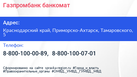 Газпромбанк, банкомат по адресу Краснодарский край, Приморско-Ахтарск, Тамаровского, 5 в дальнейшем Организация, размещена в следующих категориях:
