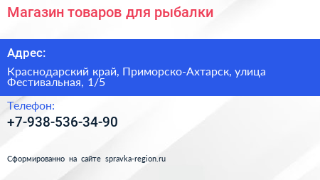 Магазин товаров для рыбалки по адресу Краснодарский край, Приморско-Ахтарск, улица Фестивальная, 1/5 в дальнейшем Организация, размещена в следующих категориях: