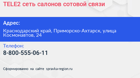 TELE2, сеть салонов сотовой связи по адресу Краснодарский край, Приморско-Ахтарск, улица Космонавтов, 24 в дальнейшем Организация, размещена в следующих категориях: