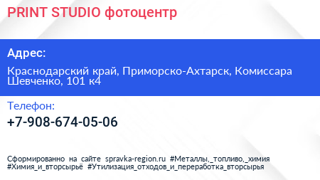 PRINT STUDIO, фотоцентр по адресу Краснодарский край, Приморско-Ахтарск, Комиссара Шевченко, 101 к4 в дальнейшем Организация, размещена в следующих категориях: