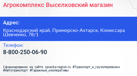 Агрокомплекс Выселковский, магазин по адресу Краснодарский край, Приморско-Ахтарск, Комиссара Шевченко, 78/1 в дальнейшем Организация, размещена в следующих категориях: