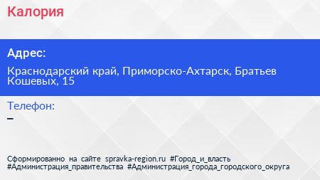 Калория по адресу Краснодарский край, Приморско-Ахтарск, Братьев Кошевых, 15 в дальнейшем Организация, размещена в следующих категориях: