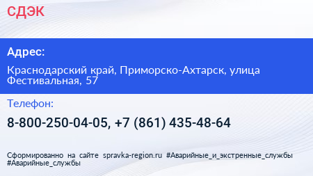 СДЭК по адресу Краснодарский край, Приморско-Ахтарск, улица Фестивальная, 57 в дальнейшем Организация, размещена в следующих категориях: