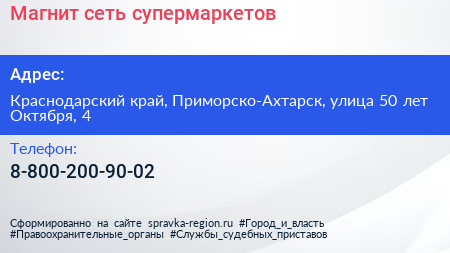 Магнит, сеть супермаркетов по адресу Краснодарский край, Приморско-Ахтарск, улица 50 лет Октября, 4 в дальнейшем Организация, размещена в следующих категориях: