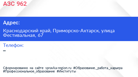 АЗС №962 по адресу Краснодарский край, Приморско-Ахтарск, улица Фестивальная, 67 в дальнейшем Организация, размещена в следующих категориях: