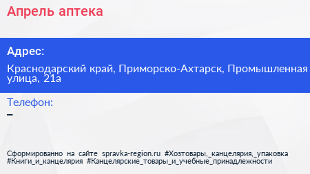Апрель, аптека по адресу Краснодарский край, Приморско-Ахтарск, Промышленная улица, 21а в дальнейшем Организация, размещена в следующих категориях: