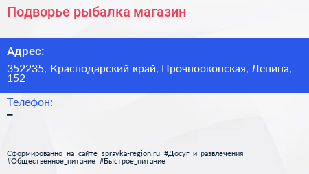 Подворье+рыбалка, магазин по адресу 352235, Краснодарский край, Прочноокопская, Ленина, 152 в дальнейшем Организация, размещена в следующих категориях: