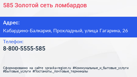 585*Золотой, сеть ломбардов по адресу Кабардино-Балкария, Прохладный, улица Гагарина, 26 в дальнейшем Организация, размещена в следующих категориях: